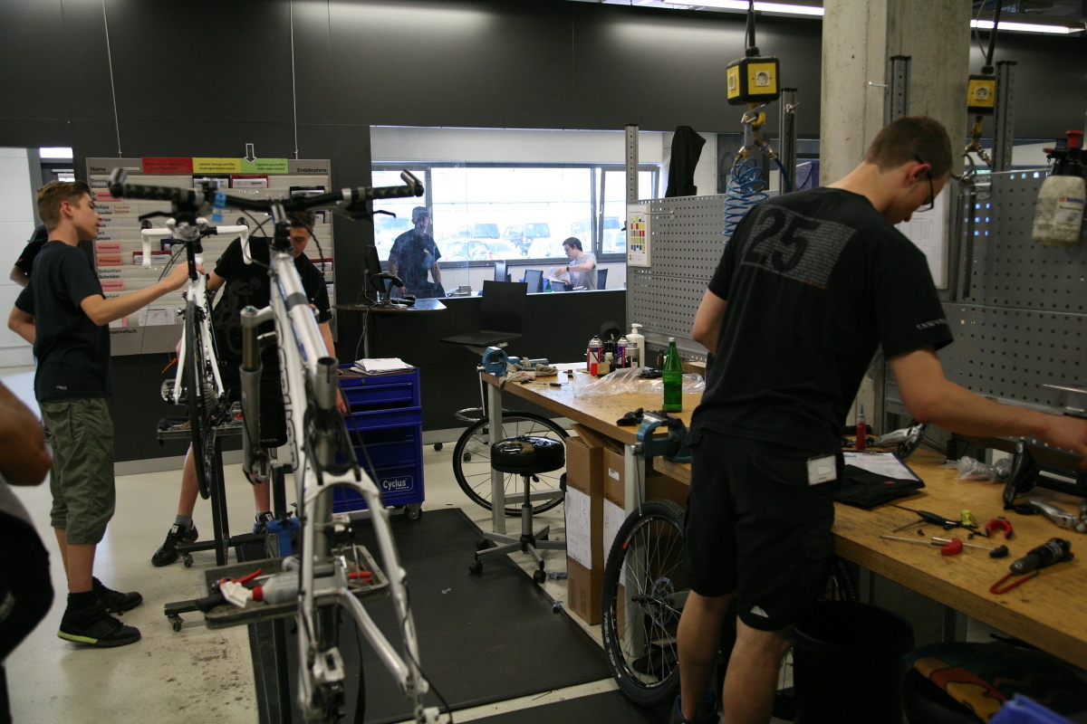 Mučení ve jménu evoluce Poslední část spodního patra patří testování. Představte si holé stěny a po obvodu rozesety mučící nástroje rámů, vidlic, řídítek, poslední z nich je „veličenstvo kat“, trhací stolice, kde pod plachtou čekal budoucí dirtový či fourcrossový rám. Díly musí přežít zátěž, počtem cyklů danou normou EAN, ale v Canyonu jsou ještě dále a měří i to co není zatím dáno normou. Poukazují na její zastaralost a nutnost aktualizace vzhledem k vývoji trhu. Kupříkladu neexistují žádné standardy pro zatížení brzdami, nejsou různorodé pro všechny styly kol. Zhruba 5 až 10 procent produkce svých výrobků testují kvůli tuhosti, takové cvičení trvá 15 minut až půl hodiny, ale celé dny v případě prototypů. Řídítka trápí 100 000 cykly ohýbání, rámu dle EAN stačí 15 000 cyklů, testerům však nikoli. Každý typ kola snese jiné nároky, nejvyšší, pátá úroveň je pro DH kola. Měření se provádí nejen v továrních na Taiwaně a v Číně, které jsou na dálku ovládány a současně sledovány kamerami, ale i v centrále v Koblenz. Další metou je CT, tedy výpočetní tomografie. Stroj zabírající polovinu místnosti stojí půl milionu Eur a slouží pro kontrolu dílů, rámů, vidlic a to nejen jejich výroby. Každý, kdo pochybuje o bezpečnosti bouraného kola může zaplatit 200 Eur za kontrolu. Rozlišovací schopnosti končí na desetině milimetru, což nestačí na zjištění tloušťky pryskyřice ani na orientaci vláken. Vzhledem k tomu, že CT pobere všechny materiály, je rychlejší vnitřní nastavení tlumiče zjišťovat přes stroj než pracně rozebírat a opět plnit. Bezpečnost práce je důležitá, okolo stroje je 10 cm olova a každý, kdo s ním pracuje má na sobě film, který posílají každý měsíc na kontrolu, zda nebyli ozářeni. V jako vrchní patro, velín, vývoj, výkresy, .. Celé patro je věnováno kancelářím, hned na chodbě je velká televize s analýzou zobrazující počet a místo přístupů na internetové stránky Canyonu. Během výkladu číslo nekleslo pod 300 unikátních adres, nejen z Evropy. Rádi by se stali ještě světovějšími, přesto nepoužívají vnější lidské zdroje, outsourcing. Důvodem je rychlost komunikace a když už je o ni řeč, celá další místnost je ji věnována. Dvě řady pracovníků vyřizují 6000 tisíc mailů a 7000 telefonů měsíčně. Komunikaci směrem ven je součástí tréninku. Další místnosti patří vývojářům, designérům a jejich náčrtům, prototypům. Každý nový model mají na starosti 3 lidi: produkt manažer, designer a inženýr, respektive ten, kdo ho nakreslí, nechá postavit prototyp a dále se stará o jeho vývoj. Pokud je třeba, nechávají vyjádřit se i univerzitu aplikovaných věd a IVW. Součástí vývoje je i retrospektiva a zpětná kompatibilita, všechny změny jsou zapisovány, mají náhradní díly i na starší modely. Uvedení myšlenky na nové kolo předchází nápad, následná analýza potřeb, designový koncept, 3D design, vzorek, funkční prototyp a jeho testování, předprodejní prototyp už je tečkou vývoje před masovou produkcí. Do vývoje silničních kol promlouvá i aerodynamika. Odpor vzduchu roste kubicky s rychlostí, proto používají nejen aerodynamický tunel, ale i CFD, počítačovou simulaci proudění vzduchu. Dokud takové měření nikdo nebude řešit u horských kol, ani oni nebudou nuceni to používat.