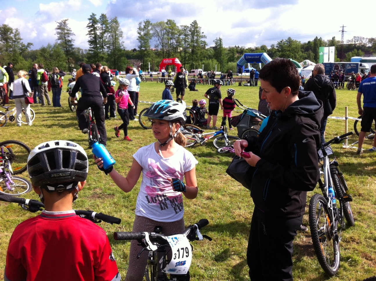 Počasí se i přes zlé jazyky umoudřilo a tak na Krásné louce na děti čekal stánek plný kol a ostatního vybavení zalitý sluncem. “Kluci ze Specialized připravili dětem, panu řediteli i paním vychovatelkám kola a ostatní věci přesně podle jejich postav. Bylo to parádně nachystané, děti jen zíraly. Abysme neztráceli čas, přihlásili jsme ty mladší tentokrát i do závodů Junior Trophy, ať si to pořádně užijou.” Popsala na úvod 25-ti letá reprezentantka ve fourcrossu. “Šli jsme do toho po hlavě a na oči. Hehe. To byl mazec. Vyslala sem tam pět ‚koníků‘ a všichni mě moc mile překvapili. Vůbec se toho nebáli. Na začátku ode mě dostali pár fourcrossových rad, ohledně ostrých loktů a tak podobně…Znáte to… Fakt jeli dobře. Sem myslela, že už s námi Fitku nepojedou, protože si celkem hrábli a nakonec je JT naladilo tak, že jeli obojí.” Dodala.