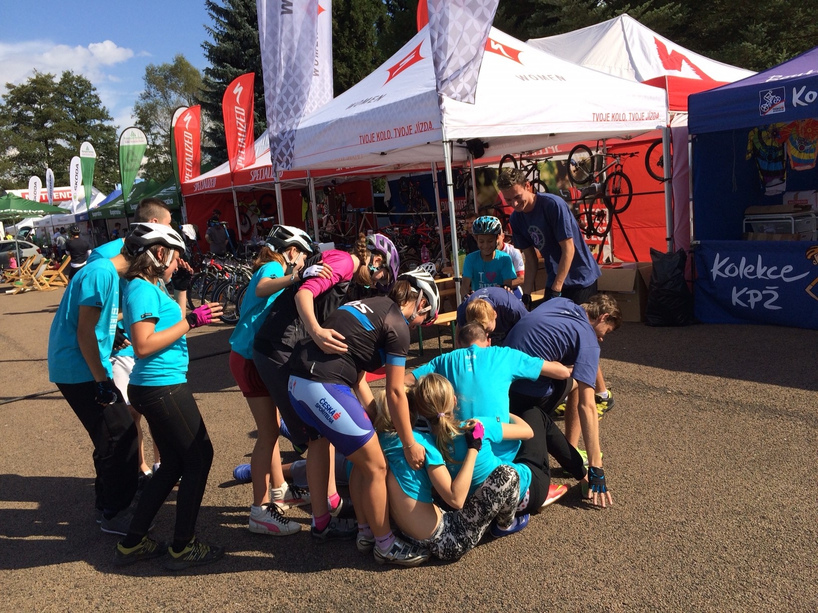 Dětí bylo tedy na tomto závodě jako smetí.Ráno dostali všichni jako vždy registrační balíček a tričko od pořadatele závodu, dále pak bidon, rukavice a svačinku od Specialized, kde v jejich depu už bylo nachystáno 16 kol a helem dvorním mechanikem Martinem Šťastným, který se o děti vždy stará s takovou péčí, že mají opravdu zázemí jako špičkoví závodníci a mohou si alespoň na jeden den vyzkoušet, jaké to je. Dopoledne následovalo zaškolování na kolech s Robem Jezlem z týmu České Spořitelny na nově vznikajícím pumptracku hned vedle areálu bývalého výstaviště. S Térou, jakožto znalou skákání a techniky následovala malá lekce ve skate parku a učení se přeskočit fun box. No a na konec prověření komplexních schopností na dřevěném pumptracku Kola pro Život. Pak byl čas na svačinu, doplnění pití a rozcvičky před startem Fitness jízdy. Dopoledne v depu to vypadalo, že všichni vyrazí na krásný závod plný sluníčka a spocených zad. No… Asi dva kilometry po startu se karty obrátily. “Děcka, musíme dojet do cíle čistí, protože s námi chce mluvit televize…” Vtipkuje ve startovním koridoru Téra. “Tzzaa…Já si nechci ušpinit tenisky, takže určitě dojedu čistej.” Odsekává jeden z kluků, Tomáš.