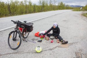 Na sever Švédska mě se všemi věcmi, kromě kajaku, dovezl přítel autem. První den jsem začala turistikou k nejsevernějšímu bodu. Druhý den jsem vyměnila pohorky za kolo, přebalila věci z batohu do tašek na kolo a vyrazila směrem k nejvyšší hoře Švédska. No a pak zbytek projektu vlastně už byl jenom o jízdě na kole, neboť jsem celkově pádlovala pouze dva dny – jeden den k nejvýchodnějšímu bodu Švédska a pak po dalších čtyřech týdnech strávených na kole a cestováním přes celé Švédsko ze severovýchodu na jihozápad směrem k nejzápadnějšímu bodu. Nejjednodušší řešení bylo proto si půjčit kajak na daném místě a netáhnout jej s sebou. Logisticky to bylo relativně jednoduché, ale i to chtělo plánování předem. Proto moje práce v průběhu roku na plánu projektu byla opravdu důležitá. Věděla jsem přesně, co mám kde udělat, takže mi odpadla spousta řešení na místě.
