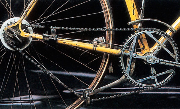 Oboustranně uložené pastorky jako doklad doby, kdy se ještě nepřehazovalo za jízdy. Pákový měnič Vittoria Margherita zapomenutého italského konstruktéra Francesca Ghigginiho na kole Gina Bartaliho z vítězné TdF 1938.