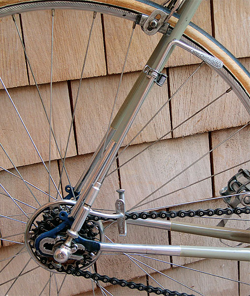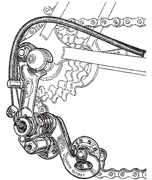 Řazení Campagnolo Paris-Roubaix s odolným vodítkem do náročných podmínek. Přehazovačka Huret z 50. let pracující s kladkami a pružinou.