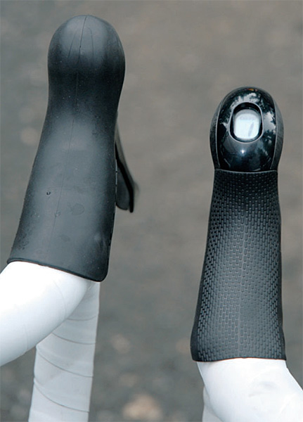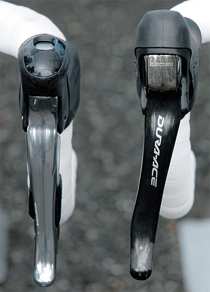 Srovnání tvaru mechanických a elektronických pák Shimano Dura-Ace 2009.