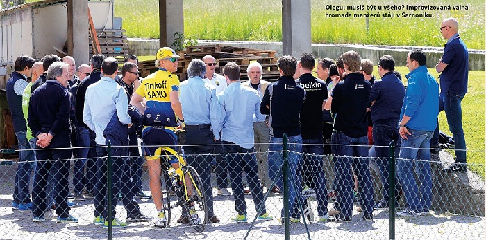 Kousek odtud, na asfaltu mezi traktory a fošnami a za nedůvěřivého dohledu místního farmáře v montérkách, jedná „krizový štáb mocných". Téma: Kdo zavinil chaos na Stelviu. Přítomni: Vedení Gira + sportovní ředitelé (takřka všichni v džínách a mikinách) + kdosi na kole a v dresu Tinkoff -Saxo. Že by zástupce jezdců? Kdepak, to si jen Oleg Tinkov přijel říct své. Dlouho mluví pouze on, navíc velmi hlasitě. Pak se otočí, odjede, a kdyby měl po ruce vázu, rozbije ji na tisíc kousků, aby se mu ulevilo. Jeho následný proslov k médiím lze shrnout: Jestli támhle ta partička nebude mít jasná pravidla jako ve formuli 1, tak do ní bohaté fi rmy, jako je ta má (ukazuje na logo Tinkoff na svém dresu), přestanou cpát prachy. Vždyť on tam nikdo ani pořádně neví, co znamená červená vlajka. Hlavně že s ní na Stelviu mávali.
