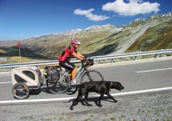 Ernest váží skoro 40 kilogramů, samotný psí vozík 15 kilogramů. Do kopců se to všechno pěkně proveze. Pokud jsme jeli po stezce, tak si samozřejmě každý kopec vyběhl. Pokud jsme někdy jeli po silnici, bylo to horší. V Normandii (kde přišly skutečné první kopce) jsme začali Ernesta trénovat na běhání do kopců na vodítku. Po pár dnech to pochopil a jeho největším výkonem bylo přeběhnutí Alp přes sedlo Flüela (2383 m n. m.). Od stoupání za Davosem až na vrchol sedla to bylo 11 kilometrů, které Ernest bravurně zvládl po svých na vodítku vedle kola. Cestou jsme udělali několik zastávek na odpočinek a osvěžení v některém z mnoha alpských potůčků, které se tu ze všech stran řinuly do údolí. Vodítko držel Michal vždy v pravé ruce, nikdy jej nepřivazoval k řídítkům či jiné části kola, pokud Ernest potřeboval něco označkovat nebo se někde víc zdržel čucháním, vodítko Michal snadno pustil, zastavil a psa si znovu přivolal.