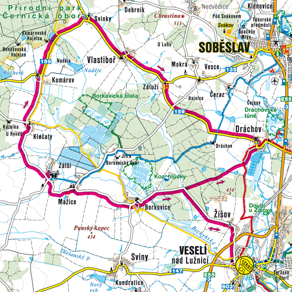 Veselí nad Lužnicí, významné to město na soutoku řek Lužnice a Nežárky a centrum zdejší oblasti, je patrně nejlepším místem, odkud se na Zelenou stezku vydat. Je sem dobré a časté vlakové spojení, takže pokud se na okruh nechystáte dojet po vlastní ose, třeba z Prahy sem vlakem dorazíte za dvě hodiny.