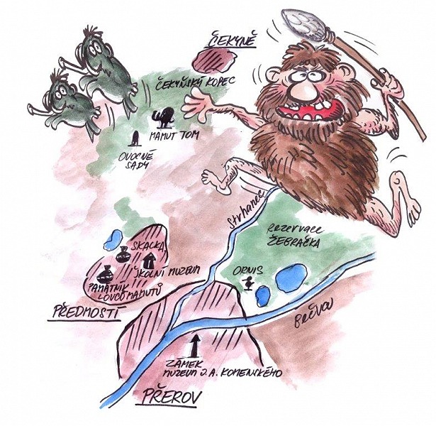 Civilizaci opouštíme jen na chvíli. Protínáme luhové háje, občas přetahujeme kola přes spadané stromy, ale již brzy se před námi objeví Předmostí. Přerovská místní část je bez přehánění jedním z největších archeologických pravěkých nalezišť v Česku. Místní školáci mají své malé muzeum přímo ve škole. Míjíme betonový pomník nazvaný Sonda do pravěku. Je na něm znázorněna rytina ženy představující onu již zmiňovanou Předmostskou madonu. Obrovské množství převážně mamutích kostí spatříme v konzervované vrstvě v Památníku lovců mamutů. A jen o kousek dál se po krátkém přejezdu podél místního hřbitova zastavujeme v místě Skalka. Kdysi dávno tu bylo návrší, odkud pravěcí lidé sledovali terén a číhali na táhnoucí mamutí stáda. Místo bylo ale vytěženo a dnes už jen stojíme mezi paneláky a pouze vystupující kameny a cedule označují tak význačné místo. Holky tu nejvíc zaujala houpačka na pružinách, a tak skotačí a divočí a jsou určitě hravé stejně jako asi před desítkami tisíc let malí pračlovíčci.