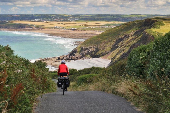 Po překonání zálivu, do něhož se stéká několik řek, jsme se malou lodí dostali do dalšího hrabství. Cornwall se od ostatních regionů v Anglii liší svojí keltskou tradicí, která se odráží v četných kulturních specifikách tohoto nejjihozápadnějšího výběžku Velké Británie. Úzké silničky nás dovedly na zapadlý venkov. Bloudili jsme mezi poli a podél větrného pobřeží. Na cestě byla jen dvě větší rybářská městečka Looe [lú] a Fowey [foj] se jmény s nepravidelnou výslovností, která odráží jejich keltský původ. Za St Austell silničky nejnižších tříd mezi farmami vystřídala naopak hlavní silnice, která nám však pomohla překonat úsek do zálivu v ústí řeky Fal. Na obou jeho březích leží hrady, přičemž ten ve Falmouth je obrovskou pevností rozkládající se nad městem. Vždy byl důležitým strážcem ústí (mouth), o čemž svědčí staré části hradu i pozdější kulometná hnízda. Návštěva tohoto hradu byla opravdovým zážitkem. Při vstupu nás pozdravila stráž a uvnitř hradu jsme potkali i jeho obyvatele. Dva vojáci právě ládovali do kanonu střelný prach, v pekárně se peklo a na tajemství kamene mudrců jsme se mohli optat přímo dvorního alchymisty. Byli to samozřejmě herci, ale svých rolí se zhostili velice dobře. Nestálé anglické počasí nás již potrápilo víc než dost. Náš už tak nabitý itinerář nabral u Looe půldruhého dne zpoždění, a tak jsme už pomalu začali škrtat z programu. Pak jsme ale škrtli zajížďku na poloostrov Lizard a celý jeden ztracený den se nám tím skoro podařilo dojet. Asi každý zná horu svatého Michala, tedy Mont St-Michel v Normandii, ostrov či poloostrov podle toho, jaká je úroveň hladiny moře při přílivu a odlivu. Méně je už znám (polo)ostrov St. Michel’s Mount v Cornwallu. Stavba kostela a hradu na cornwallském ostrůvku byla inspirována zmíněným velkým vzorem na druhé straně kanálu a stejně jako v Normandii, i tady je pevnost přístupná suchou nohou pouze za odlivu. Bohužel, rozhozený plán způsobil, že k ostrovu jsme se dostali za přílivu a nemohli ho tak navštívit a ani čekat, až opět nastane odliv. V kanálu je jeden z největších odlivů a přílivů na světě. Rozdíl hladin tu může dosáhnout až 12 metrů. Čas kvapil a my si vytkli za cíl dosáhnout nejzápadnějšího cípu Velké Británie ještě toho večera. Zdálo by se, že necelých 30 kilometrů je vlastně za rohem, jenže to by nesmělo tak silně fučet. Přímo proti, samozřejmě. Pak jsme konečně dorazili na Konec země. Land’s End, nejzápadnější výspa Velké Británie, kamenný mys ošlehaný větry a bičovaný příbojem Atlantiku. Symbolicky na tomto místě stojí první a poslední dům v Anglii. Zatímco vítr nemají cyklisté v lásce, surfaři ho vítají. Pro ně jsou velké vlny způsobené větrem výzvou, jak mi o tom vyprávěl při večerním čaji Steve, jeden ze surfařů, který měl chatku hned vedle našeho stanu. Jezdí sem už skoro 20 let a za vlnami sjezdil půl zeměkoule. Dosažení mysu Land’s End bylo jedním z významných milníků na cestě. Z jižního pobřeží kanálu La Manche jsme se dostali na severozápadní pobřeží u Keltského moře. Právě tady nám pozůstatky starých cínových a měděných dolů připomněly tvrdou práci zdejších horníků, kteří za velmi krutých podmínek těžili rudu. Dnes jsou pozůstatky dolů zapsány za seznamu UNESCO. Kolem celého jihozápadního poloostrova Velké Británie je po pobřeží vyznačená přes tisíc kilometrů dlouhá South West Coast Path, fantastická pěší trasa. Bohužel cyklisté si romantického pobřeží tolik neužijí, protože silnice vede často dost daleko od pobřeží a k jednotlivým výhledům je třeba odbočit, pokud to vůbec jde. Za přelidněným turistickým centrem St Ives se však konečně silnice častěji přimkla k pobřeží a my jsme mohli více vychutnat útesy i podél naší trasy. Jenže čím více byla silnice u pobřeží, tím strmější kopce jsme zdolávaly z útesu k ústí a zase na útes. Do jedné osady jsme klesali a opět vystoupali sklon 30 %. Údaj na dopravní značce potvrzuji i z tachometru. Je neuvěřitelné, že právě tady jsme na malém úseku potkali nejvíce naložených cyklistů za celou naši výpravu, neboť právě tudy vede jedna z anglických dálkových cest NCR – National Cycle Route 3. Tento úsek cesty po pobřeží Cornwallu až po mys Hartland s četnými strhujícími výhledy na stříkající příboj a tajemné ukryté pláže patrně patřil k těm nejhezčím na trase.