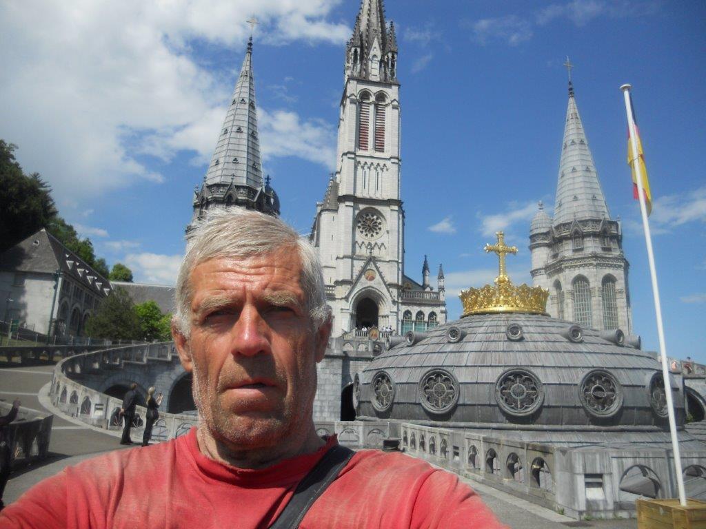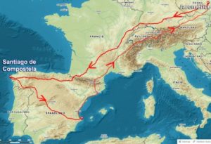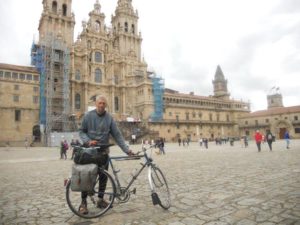 Na cestu jsem vyrazil od své chajdy 30. dubna 2018. Přes Českomoravskou vysočinu do Strážného. Tady jsem měl asi největší poruchu na svém kole za celou tuto výpravu. Když jsem u jednoho obchodu nasedal na kolo, ulomila se mi levá půlka řídítka. Ještěže to nebylo ve sjezdu! Obešel jsem Strážné, u jednoho chlapíka našel ve šrotu ocelovou trubku odpovídajícího průměru i délky, ani nebylo potřeba nic řezat, během půlhodinky jsem to přemontoval a mohl pokračovat v jízdě. Jen moje zahnuté brzdové páčky měly menší zdvih, takže mi to od této chvíle brzdilo hůře. Ale na to se dá zvyknout. Když bylo nejhůř, brzdil jsem botou o asfalt. Dál mě cesta vedla do Dachau, dost dlouho podél Dunaje, až z něj zbyla úzká říčka. Přes kopce do Freiburgu, odkud jsem poslal pozdrav svému dobrodinci Helmutu Stiedlovi, který zde žil dlouhá léta, než se odstěhoval do Jižní Afriky, kde jsem ho poznal. Následoval Lyon. Po policejním vyhazovu z dálnice jsem jím projel celkem nerušeně podle řeky Rhôny po cyklostezce, jinak bych se z provozu asi zbláznil. Pak jsem trochu bloudil v pohoří Monts du Forez, kde jsem v malé osadě Col de la Croix Ladret omdlel vysílením, když mi domácí ukazovali v podrobné mapě správnou cestu. Předtím jsem já trouba podcenil zásoby jídla. Pak už to byla pohoda. Venkov, příjemná krajina. Lurdy. Ani jsem nečekal, že mě tak nadchnou. Dál bylo dost kopců, až jsem se dostal do průsmyku Port de Larrau 1585 m n. m. Moc hezké rozhledy. A už jsem svištěl do Španělska. Hned první nebo druhá vesnice na mě udělala dobrý dojem krásným středověkým kamenným mostem. Puente de la Reina, tady už jsem předjížděl pěší poutníky. Soutěska na řece Ebro, nádhera. Lugo, tady už bylo poutníků s batohy na zádech a často s hůlkami víc. A že míří tam, kam i já se lopotil, prozrazoval symbol této cesty – svatojakubská mušle na batohu. 30. května navečer jsem byl u dílčího cíle před svatojakubskou katedrálou. Bohužel byla částečně kryta lešením kvůli opravám. Počasí bylo ponuré, uvnitř kostela to bylo také smutné a samo město Santiago de Compostela bylo pro mě příliš veliké. V Lurdech se mi líbilo víc. Nádherná je obzvlášť poutní část zasvěcená Bernadetě Soubirousové, které se tu prý zjevovala Panna Maria. Další den jsem dojel k majáku na mysu Finisterra a pak zamířil napříč Španělskem k Středozemnímu moři. Padrón, Orense se zajímavým moderním mostem, Salamanca, kde je nejstarší španělská univerzita. Kdybych tudy projížděl před několika staletími, měl bych šanci tady potkat Hernána Cortése, slavného dobyvatele, který tady studoval, nebo Kryštofa Kolumba, jenž se zde připravoval k objevům nového světa.