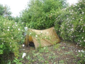 Ubytoven pro poutníky jsem nevyužil ani jednou. Většinu nocí jsem strávil pod hvězdami, což mám nejraději, jen když hrozil déšť, stavěl jsem svůj osvědčený vzdušný stan bez podlážky. Jenom jsem si přibalil zmenšenou karimatku kvůli zádům. Spacák by se mi hodil asi dvakrát, to když v horách poletoval mokrý sníh. Neměl jsem ho s sebou. Stačil jednoduchý pytel ze šusťákoviny a plastový tkaný pytel od brambor. Obojí rychle schne. Když není méně než plus 8 stupňů, jsem zdráv a v suchu, spolu s běžným oblečením mi to k tepelnému komfortu stačí.