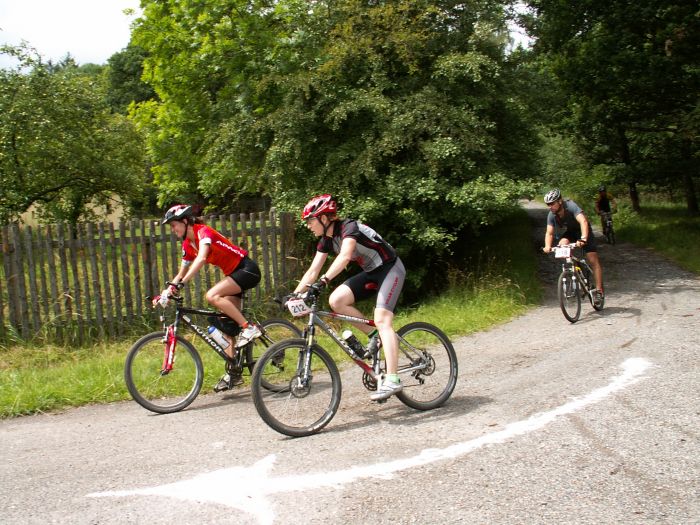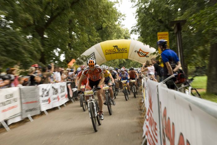 Rychle tedy připravit bika a hurá na startovní čáru. Desátá hodina a třicátá minuta znamenala startovní výstřel pro sto padesát jedna borců, kteří se rozhodli poprat o umístění, body do série, ale i sami se sebou. Klikatá cesta napříč městem vyvolala trochu nervozity, jen těsné mezery mezi jezdci nedávaly mnoho prostoru pro manévrování. V tomto kompaktním sevření pak celý had závodníků vjížděl i na polní cestu vedoucí k lesu. Jak se zde bude asi bojovat skoro pěti stovkám účastníků kratší trasy… Vzápětí ale bylo možné získat částečnou odpověď: první čtvrthodinu totiž jeli závodníci neustále do mírného kopce, tempo začalo pomalu oddělovat jednotlivé skupinky od sebe a po chvíli již bylo potřebného prostoru dost.
