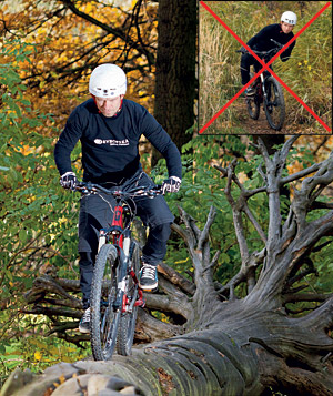 3. Očima byste měli sledovat překážku či stopu těsně před předním kolem a občas zkontrolovat, co vás čeká v příštích metrech. Rozhodně byste neměli urputně sledovat jen přední kolo. Dobré je mít připravený jeden nebo dva prsty na brzdových pákách, protože někdy se ztráta rovnováhy dá vyřešit i přibržděním. Zastavíte tak energii, která vás žene někam pryč z překážky. Pokud nejste trialista a neumíte stát na místě, tak se musíte dokázat hodně rychle rozjet správným směrem kupředu. Musíte přidat plyn. Jednodušší je samozřejmě jet vestoje, kdy máte větší možnost pohybu. Je ale dobré trénovat rovnováhu i vsedě, v krizových momentech si pak stačí jen trochu vysednout.