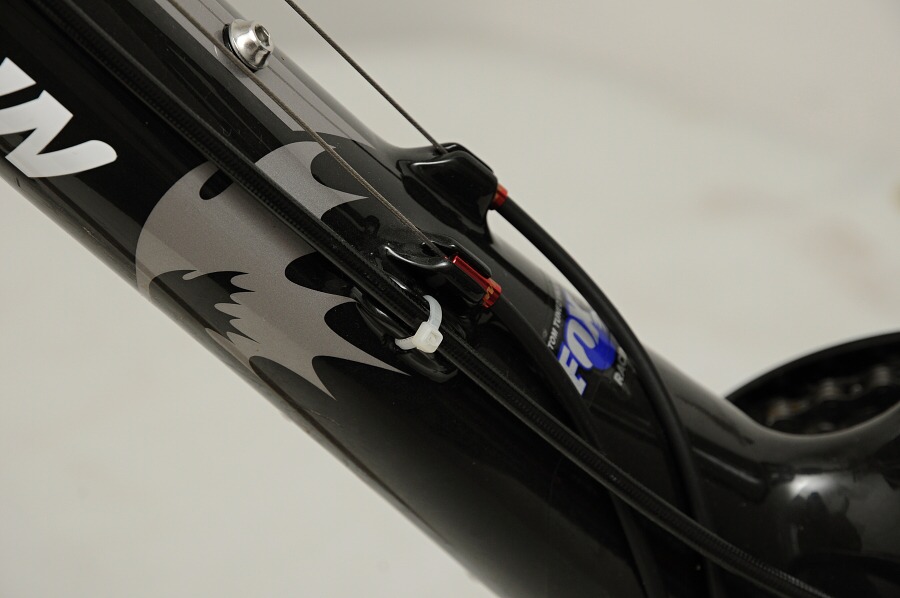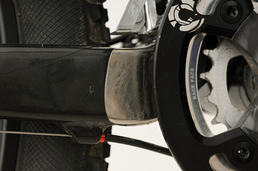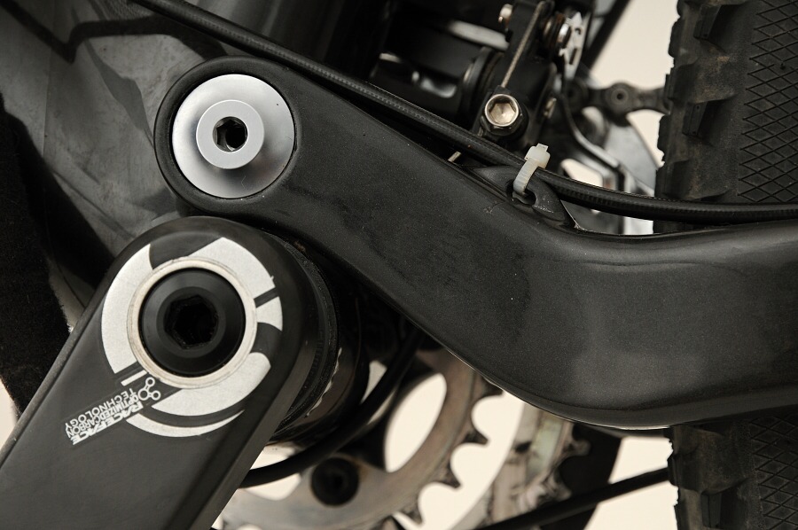 Konstruktéři šli s trendy a sáhli po kuželovém sloupku vidlice. U zadní patky však naleznete pomalu se vytrácející redukci pro montáž třmenu brzdy. Přesmykač je uchycen přímo k zadní stavbě a středové složení nalisováno do rámu. Zajímavým prvkem je tak trochu trekovská polointegrovaná sedlová trubka a rovněž i to, že sedlové vzpěry nejsou spojeny. Element zdědil od hliníkové verze umístění tlumiče pod horní trubku, a to zcela záměrně kvůli snadné dostupnosti páčky ovládání tlumení pružicí jednotky. Tlumič je zde i velmi dobře chráněn proti odletujícím nečistotám, jen s montáží druhého košíku na obvyklé místo nepočítejte. Otvory pro něj byly přesunuty na spodní stranu dolní trubky. V Kanadě dobře ví, jaké kanonádě je spodní trubka během jízdy vystavena, bovdeny a hadičky tak jsou bezpečně vedeny vrchem spodní trubky. Palec nahoru.