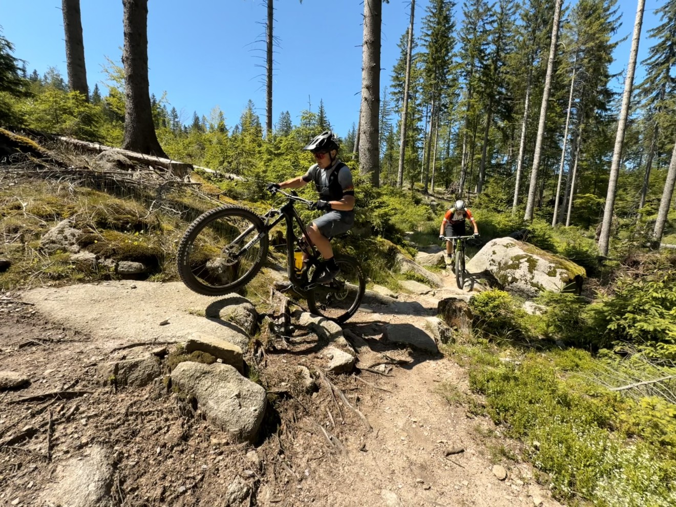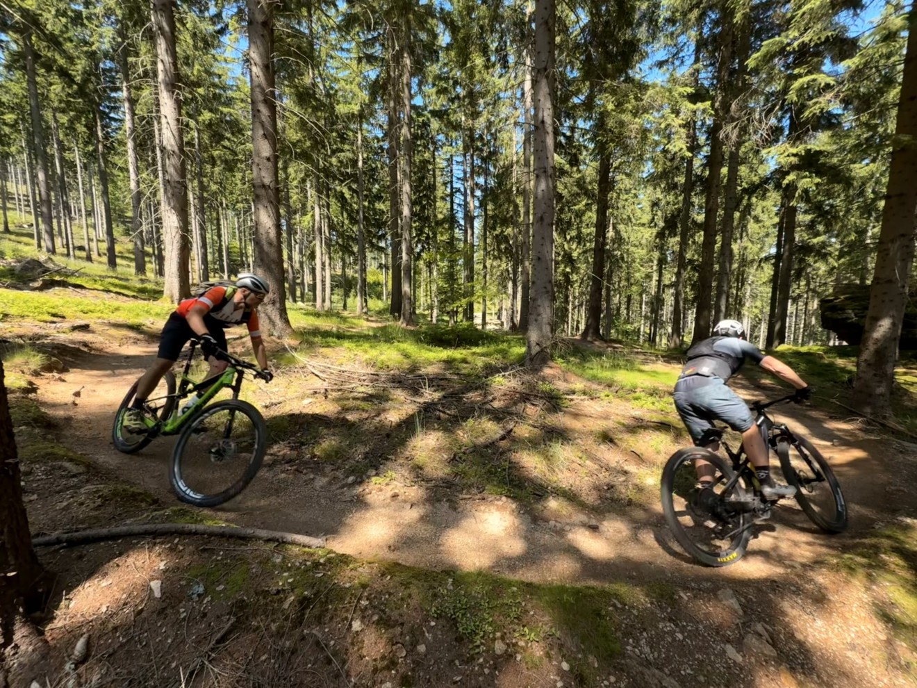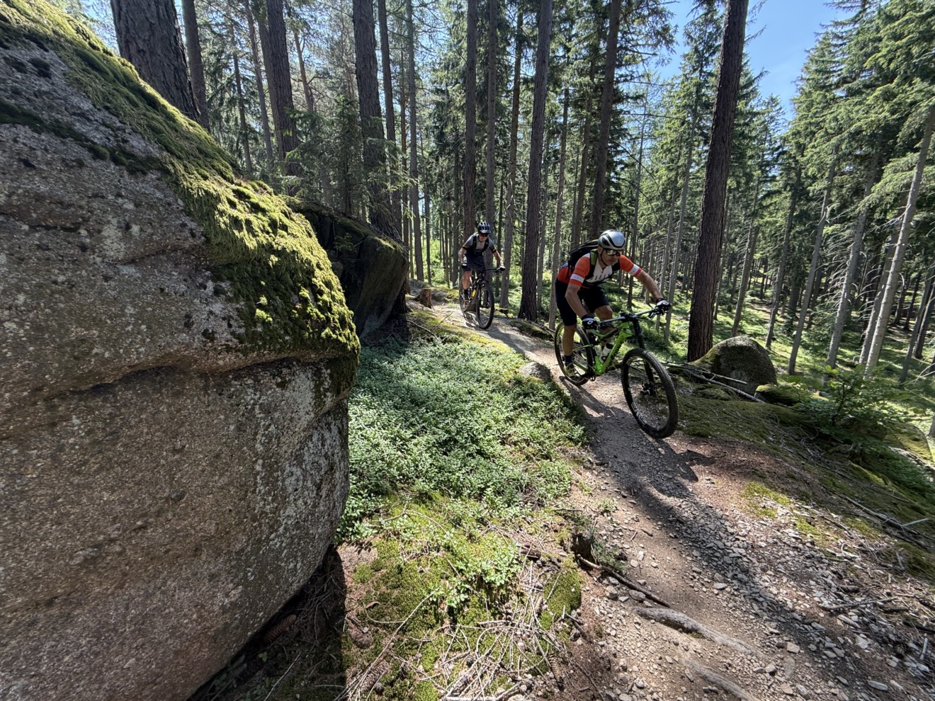 Opět to bylo úžasné. Motali jsme se jak cestičkou v borůvčí, tak šplhali po skalách vzhůru. Dolů se spíše traverzovalo nebo klesání netrvalo dlouhou dobu. Krásný trail byl Czart. Jak již název napovídá, byl nejvíce technicky náročný, a musím říct, že sjíždění posledních kamenných pasáží zakousnutých do skal bylo velkou duševní pastvou. A úžasné výhledy k tomu. U těchto trailů je již daleko větší pole oslovených jezdců než náš první den tady, který by bylo ideální trávit na trail biku. Dnes jsme se svezli pohodlně všichni. Jak trail bike, tak XC raketa a můj DC bike si přišly na své a dokázali jsme celkem pohodlně držet společnou notu. Ale ač říkám, že svezení je tady skoro již pro každého a že je to již mnohem snazší, byli jsme vyšťavení po 35 kilometrech jak limetka na mojito party.