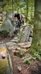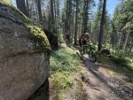 Ihned z parkoviště se line techničtější stoupání. A nejen to, je i celkem prudké. Nástupní lajna. Charakter okruhu je výrazně pomalejší než první den. Máme pocit, jako by někdo natáhnul Rychlebské stezky či Trutnov trails na 20 kilometrech. Žádná hluchá místa, žádné přejezdy, kde byste se nudili. Pořád zábava a bikerská práce, nahoru i dolů musíme s kolem pracovat. Zdolávat při výjezdu skalky, které jsou kombinovány s vyskládanými kamenitými chodníčky. Pak se to lehce rozjede, ale šutry tu jsou furt. Hlavně se nenechte unést a stále dávejte pozor. Všechny exponované úseky jsou skvěle označeny. Cedulky s vykřičníky jsou dobře vidět, a myslím, že jsem zahlédl i textové upozornění.
