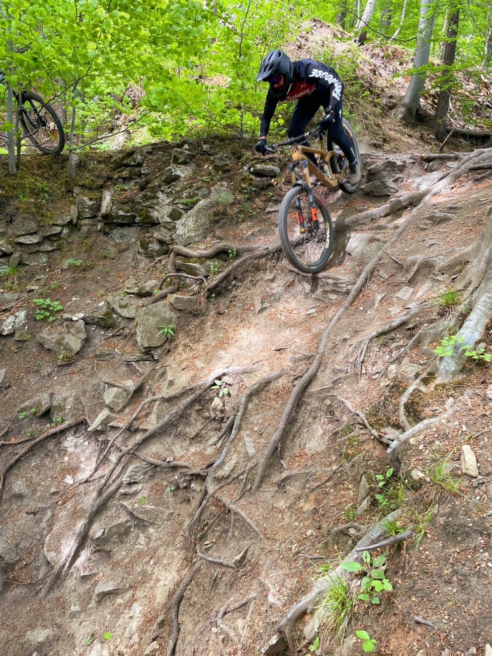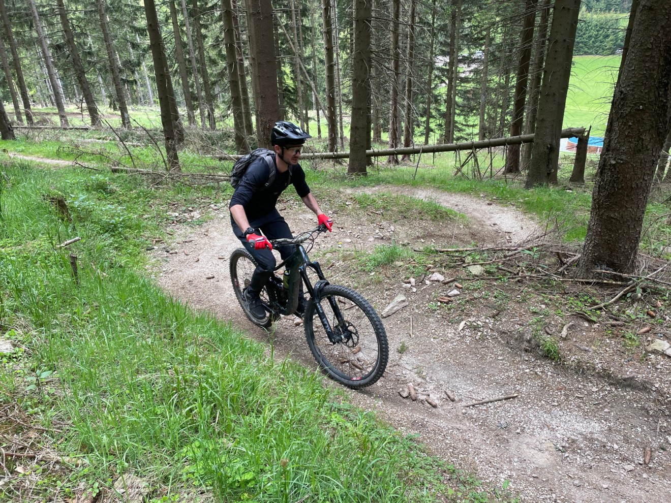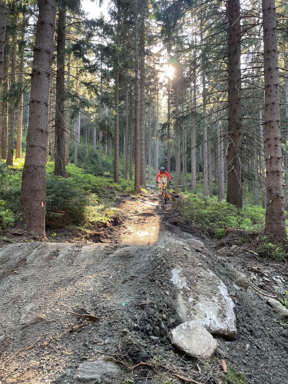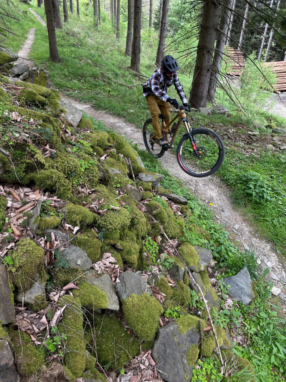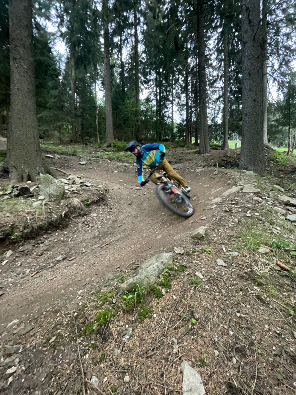 Nechceme ale vytvářet dojem, že je tu jen flow trail a pak zase jen těžké enduro. Kdepak. Jsou tu lajny vše druhu. Pěkně odstupňované a v mapce přehledně vyznačené. Každý si tu přijde na své. A když už jsme nevěděli coby, sáhli jsme na trasy, kde jsme mohli zdolat několik velmi strmých a technických pasáží a na konci se parádně proletět s hlavou v oblacích. Tahle rozmanitost nás opravdu bavila.