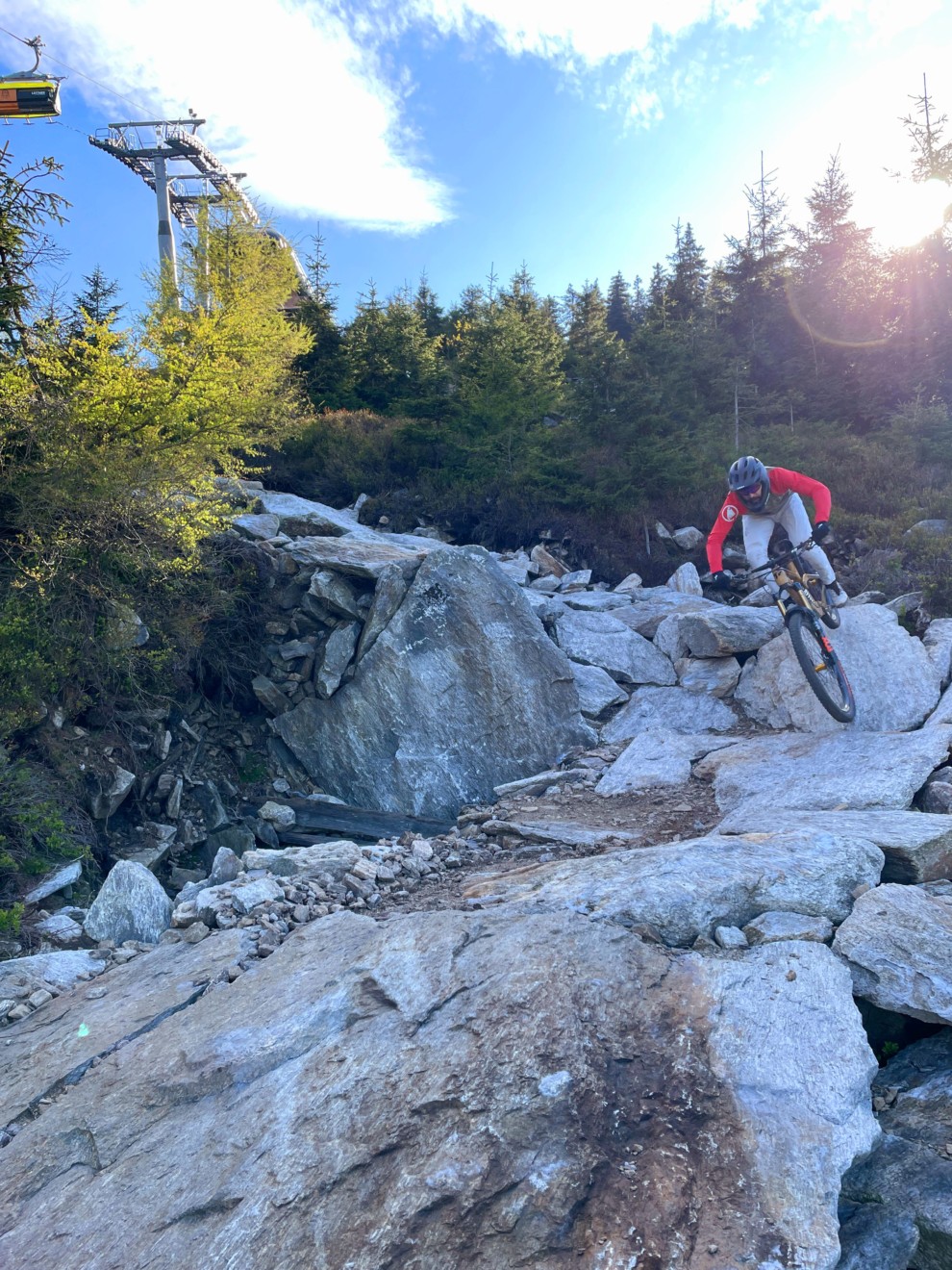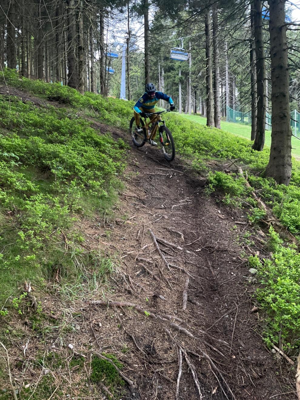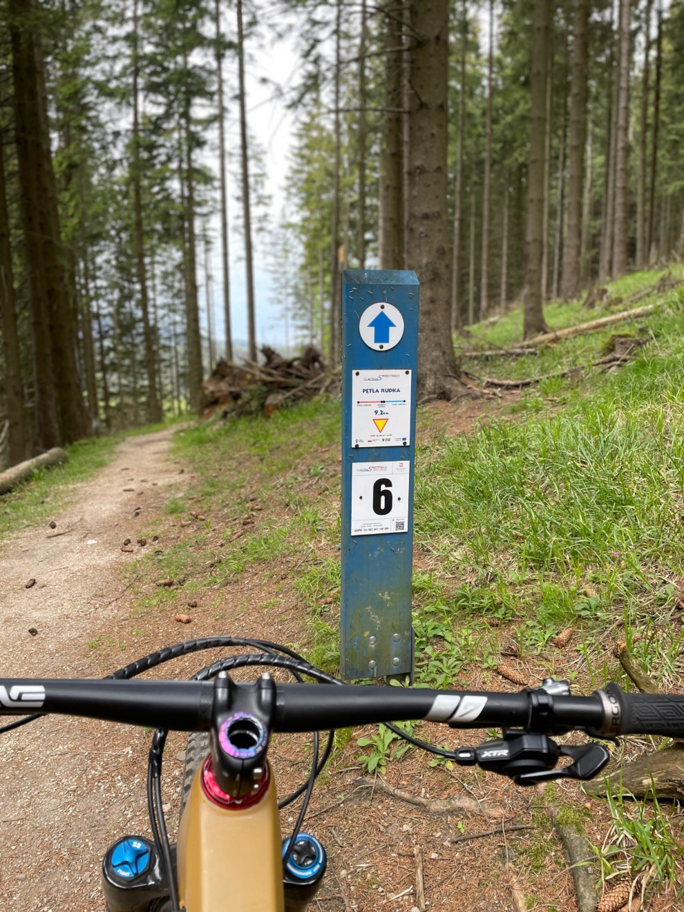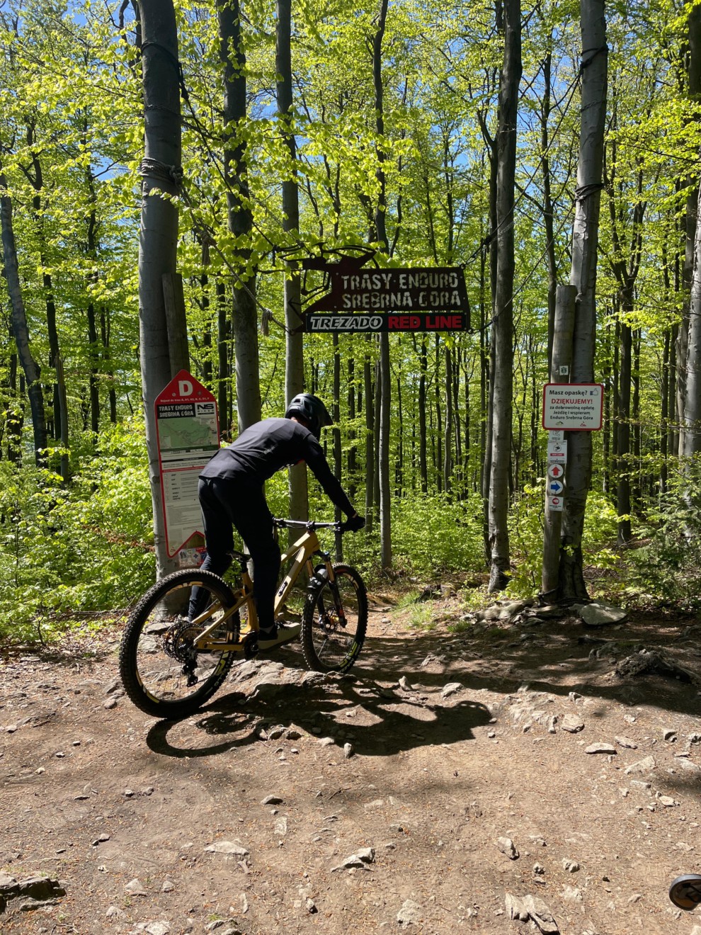 Bike Park Czarna Góra zahrnuje 19 trailů. Od těch lehčích až po černé, které nesou označení dvou diamantů. Jo, jsou pěkně vybroušené! My máme to štěstí a ve stejný čas tu s námi trénuje polský národní tým. Připravují se na EWS závody, které se mají jet následující víkend ve městě Bielsko-Biała. Zázemí bikeparku je velmi slušné. Nabízí několik kaskádovitých parkovišť se zpevněnou plochou, kde si každý najde to své místečko, jedním otočením pedálů odsud dokloužeme k shopu, kde pořizujeme permice na lano. Jsou cenově srovnatelné s českými, a tedy mnohem levnější než v západních zemích. A zároveň nám Maciej ukazuje výborné zázemí obchodu. Můžete tu pořídit takřka cokoliv na kolo i na sebe, a za rozumné ceny.