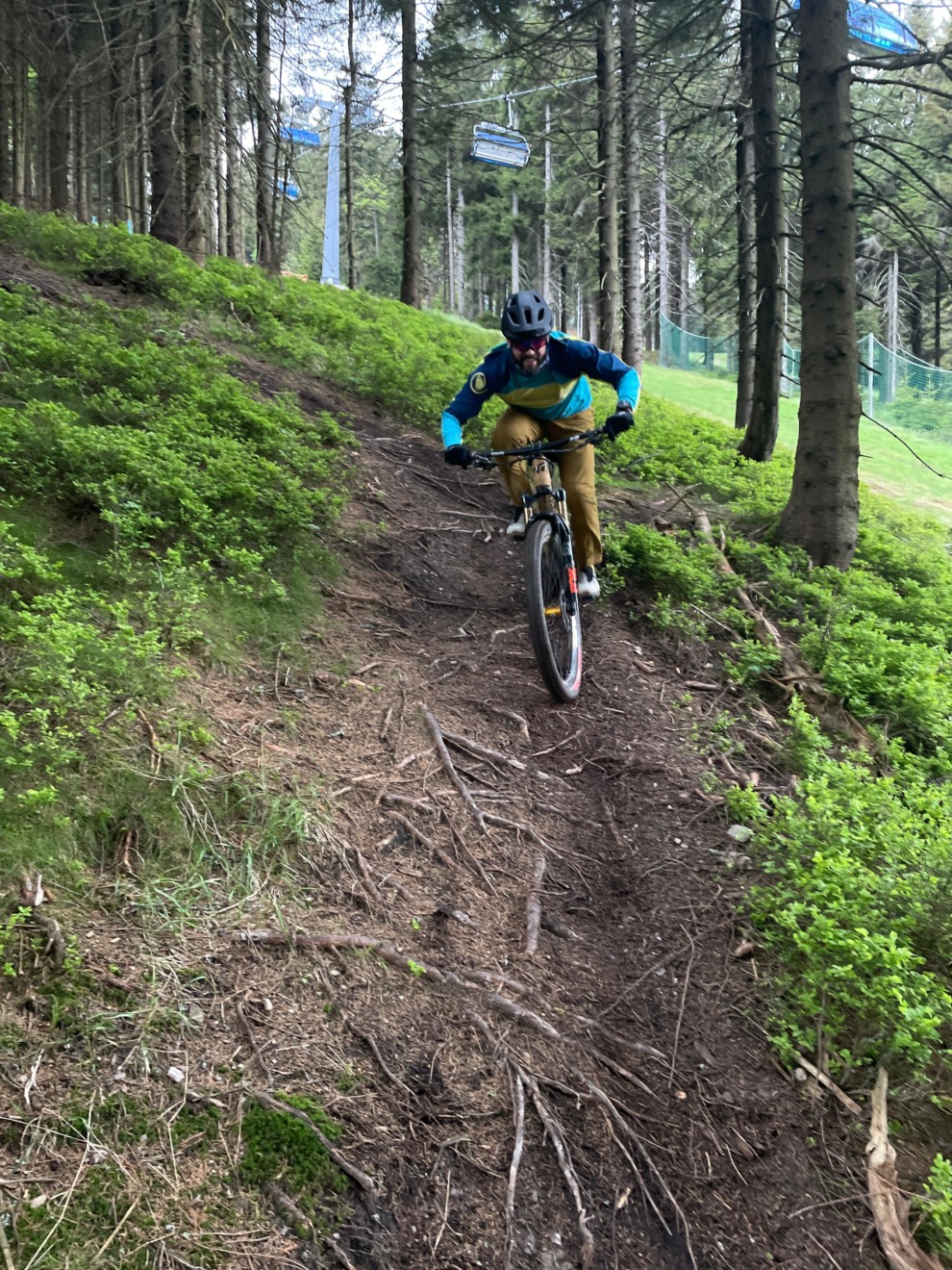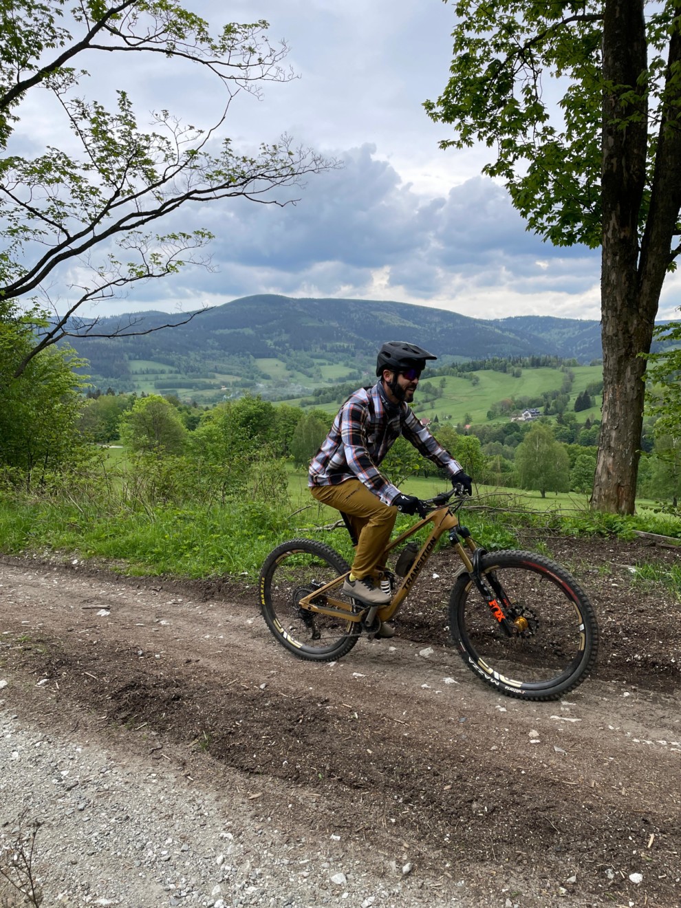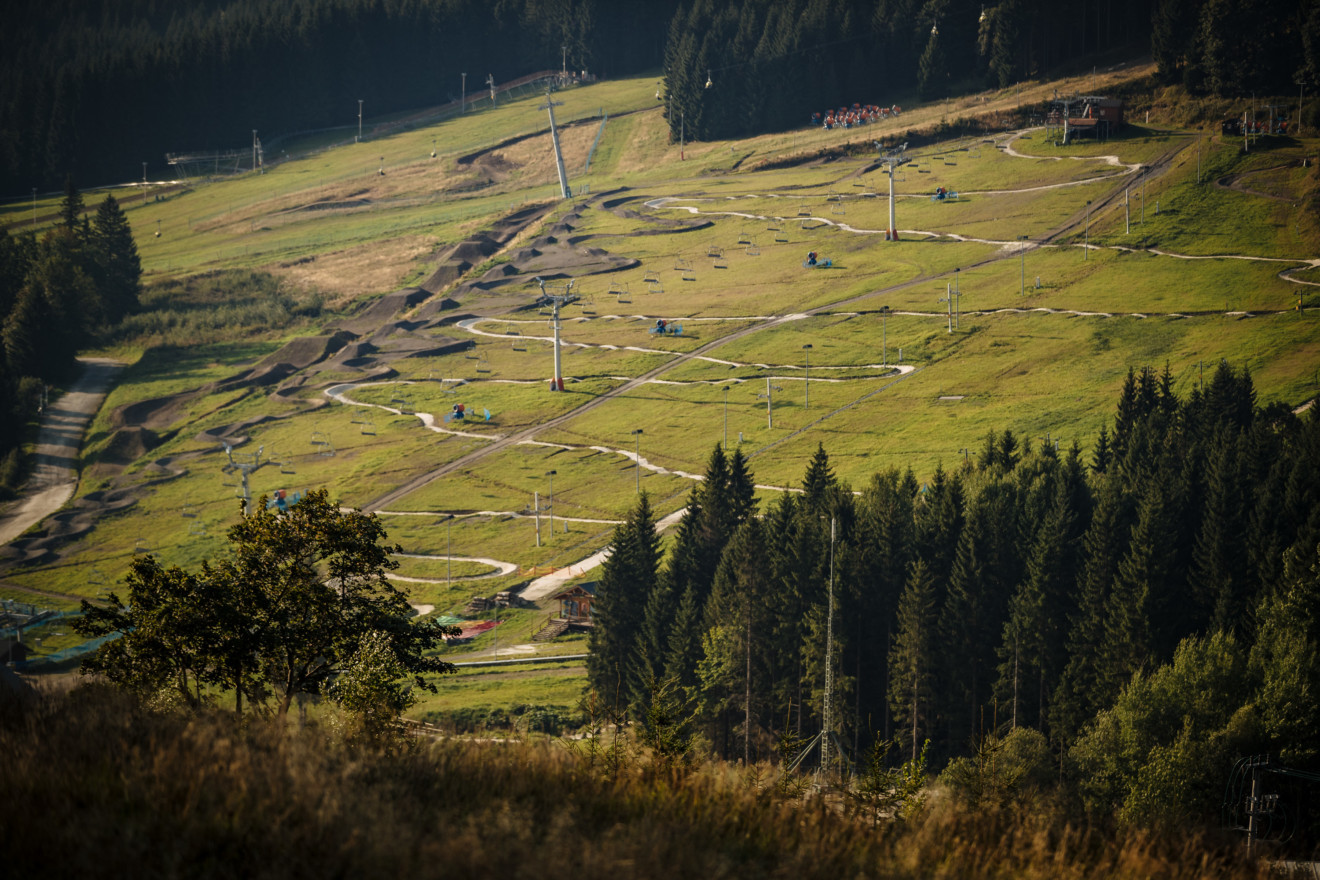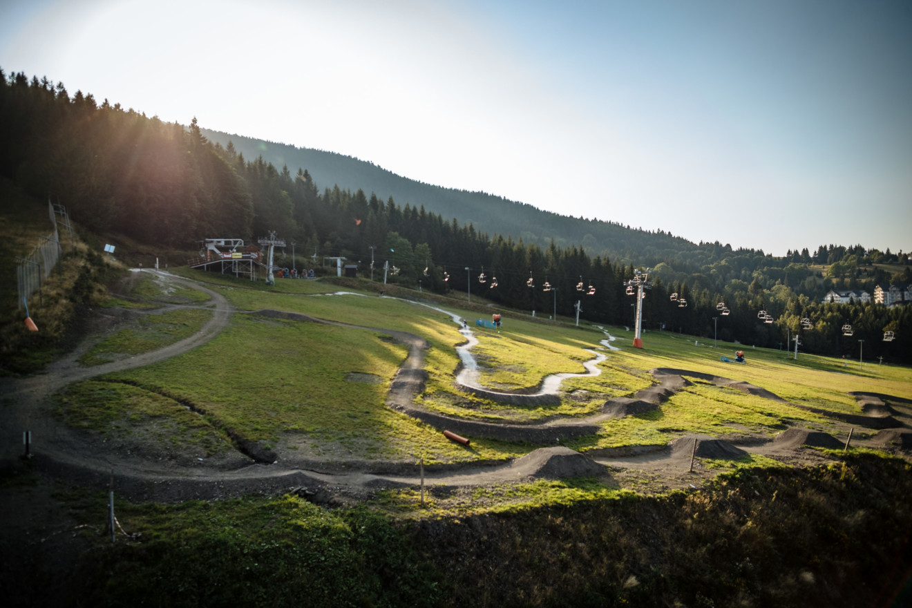 Příjezd k Bike Parku Czarna Góra je opět něco kolem hodiny po klikatých cestách, které až tak nepřekypují dopravou, a tak se můžeme těšit z parádních výhledů. Na místě na nás čeká Maciej, který nás provádí po trailech bikeparku a zároveň vypráví a osvětluje fungování tohoto komplexu, který je obklopen sítí singletracků. Již z vyprávění je jasné, že tady to bude celý den v endurovém a sjezdovém rytmu. Takže lehce přifouknout gumy, fullface helmu, páteřák, chrániče na kolena i lokty a hurá k lanu.