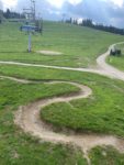 Bikepark je určen pro vyznavače terénní cyklistiky, a tak na kopci nacházíme jen několik trailů s modrou barvou ve značení. My jsme začali s Milky way, kterou jsme kombinovali ve spodní polovině s dalším, o něco techničtějším trailem. Na modrých potkáváme i male sviště s tátou a mámou, neohroženě se řítící dolů. Všude to drncá, trail se klikatí. Je to krásné, je to zábavné, ale není to rovné. Flow v podobě štěrkového trailu zde nehledejte. Tady se drncá od začátku do konce.