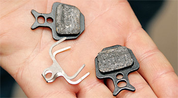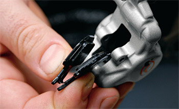 4. Destičky společně s rozpěrnými pružinkami jednoduše z těla třmenu vyjmeme. Vyměníme je za nové, popřípadě lehce osmirkujeme a očistíme staré.