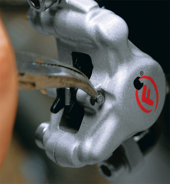 Výměna a údržba brzdových destiček 1. Výměna a údržba brzdových destiček je velmi jednoduchá. Pomocí plochého předmětu nejdříve roztáhneme pístky na maximum.