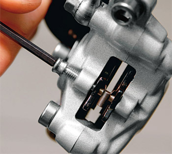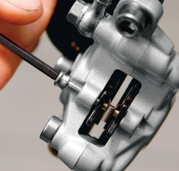 Odvzdušnění systému 1. Pomocí plochého předmětu roztáhneme destičky na maximum, demontujeme odvzdušňovací šroub na třmenu umístěný v kloubu vedení.