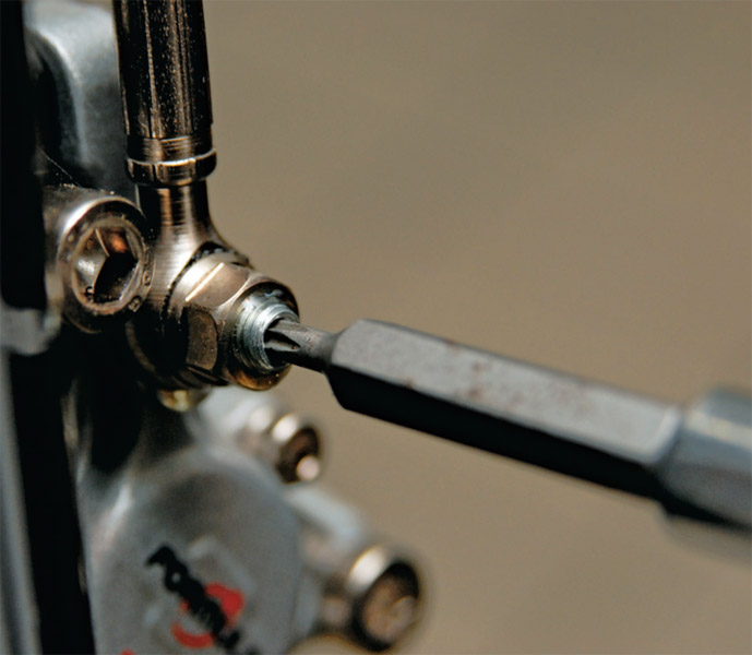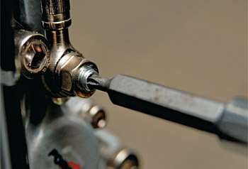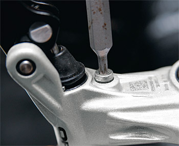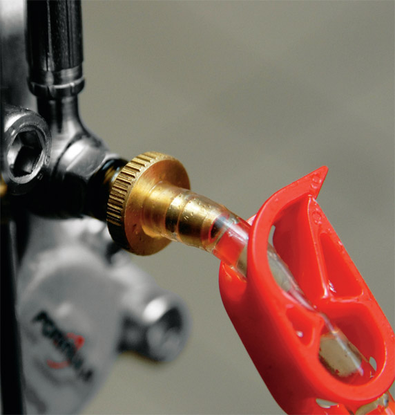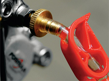 6. Opačným pohybem pístu stříkačky u páky brzdy vytvoříme podtlak, čímž ze systému vysajeme poslední vzduchové bubliny. To opakujeme zhruba tři- až čtyřikrát. Zpětným umístěním šroubu zaslepíme otvor u brzdové páky a tím je proces odvzdušnění zakončen. Vše důkladně otřeme a celou brzdu vrátíme na původní místo.