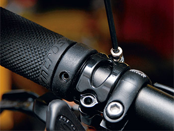 3. Brzdovou páku demontujeme z řídítek (díky dělené objímce není zapotřebí manipulovat s gripy ani řazením) a umístíme ji do vertikální polohy tak, aby odvzdušňovací šroub směřoval kolmo vzhůru. Optimální je demontovat kompletní brzdu a páku umístit například z boku představce, na jiná samostatná řídítka či na kulatinu upnutou do svěráku.