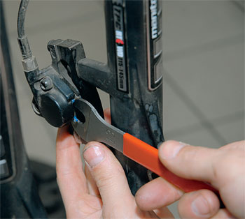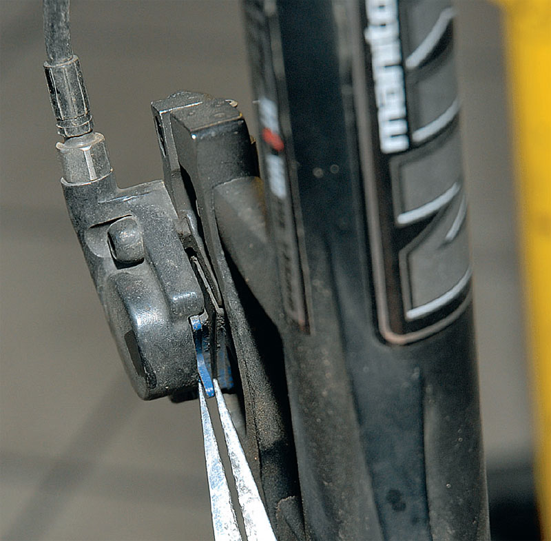 Šroub s citem utáhneme – pozor na přetažení, hrozí poškození závitu – a zaslepíme otvor v páce. Vše důkladně otřeme. K vystředění destiček dojde také automaticky po nasazení kola a několikerým zmáčknutí brzdové páky. Pozor na vytékající kapalinu, aby se nedostala na destičky – hrozí jejich znehodnocení!