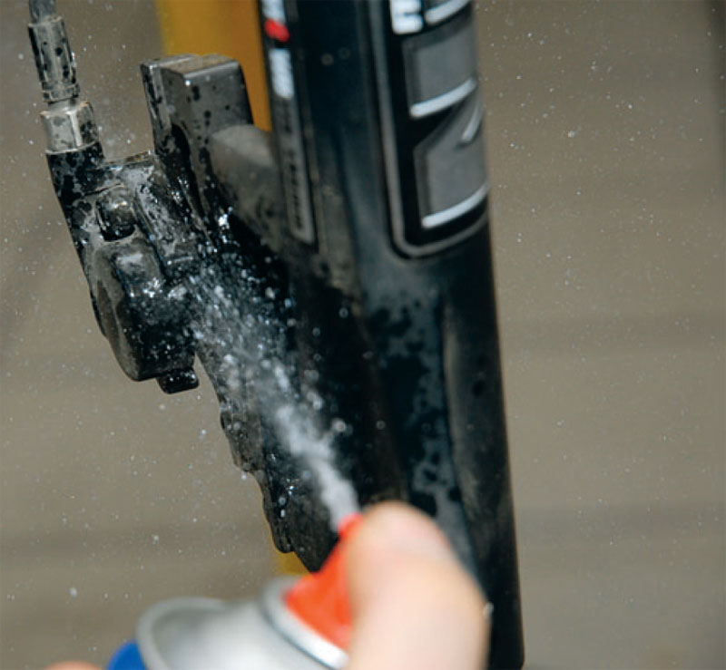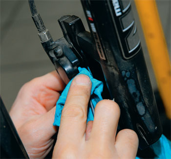Pomocí kousku hadříku navlečeného například na tenký šroubovák vyčistíme celý pracovní prostor uvnitř třmenu, popřípadě si můžeme pomoci čistícím prostředkem (například Cyklostar, může být i přípravek na čištění brzd).