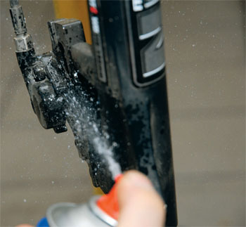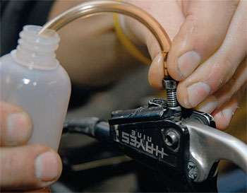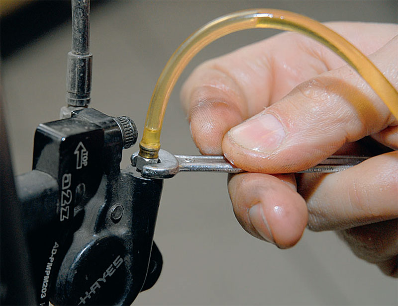 Vzduch musí pryč Odvzdušnění brzd Hayes se neprovádí konvenčním způsobem jako u ostatních kotoučovek, tedy při odkryté expanzní nádobce, ale pomocí odvzdušňovacích adaptérů dodávaných k brzdám. Pozice kola v montážním stojanu by měla být minimálně vodorovná, lépe však nakloněná tak, aby se odvzdušňovaná páka dostala do nejvyššího bodu. V případě modelů HFX 9/Mag je navíc nutné povolit objímky a natočit páky, aby odvzdušňovací otvory čněly kolmo vzhůru. Samotné odvzdušnění se neobejde bez potřebných přípravků, v tomto případě se jedná o speciální sadu, kterou lze nahradit tenkou hadičkou z měkčeného PVC a uzavřenými, pokud možno průhlednými nádobkami. Dobře se také osvědčilo použití velké injekční stříkačky. Využít lze i skleničky či kelímky, manipulace s nimi je však špatná. Dále je zapotřebí stranový klíč.