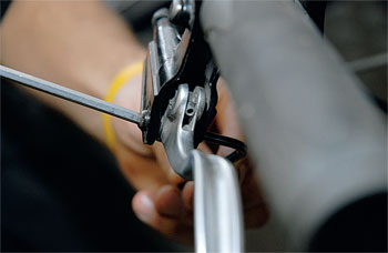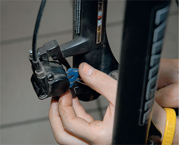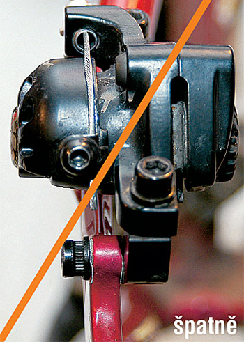 Mechanika jako přes kopírák Pro mechanické brzdy platí stejný postup pro výměnu destiček, vystředění třmenu je podobné. Liší se pouze konstrukcí, kdy jedna pohyblivá brzdová destička tlačí na kotouč a dále na zadní, pevně uchycenou destičku. Tu je zapotřebí seřizovat v průběhu opotřebování přibližováním ke kotouči.