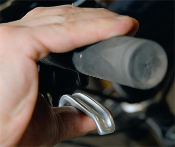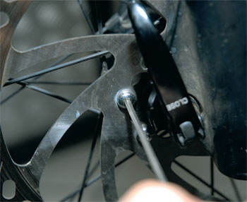 Poté ji přidržíme stisknutou a utáhneme šrouby třmene. Brzdový kotouč (za předpokladu, že je rovný) by pak neměl nikde škrtat. Pokud k tomu dochází (při utažení šroubů třmene se přes veškeré úsilí třmen nepatrně pohne), můžeme si pomoci proužky tenkého materiálu (velmi dobře se osvědčily vizitky) vloženými před zmáčknutím páky mezi destičky a kotouč.