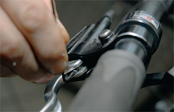 Šroub povolíme asi o čtvrtinu otáčky a zároveň lehce tlačíme kapalinu do systému – jakmile začne protékat skrze brzdovou páku, zmáčkneme ji a necháme samovolně vrátit do výchozí polohy.