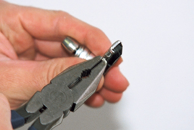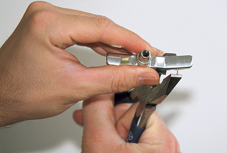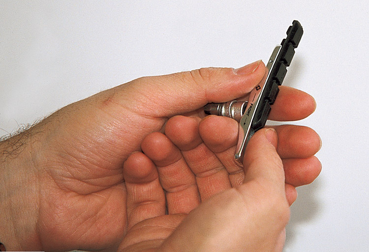 K brzdovému špalku se nejlépe dostanete po jeho vyjmutí z čelistí. Usnadní to též vyčistění systému v průběhu montáže. Prvním krokem v případě, že čelisti jsou vybaveny kovovou botkou, bude vytažení zajišťovacího perka kleštěmi.