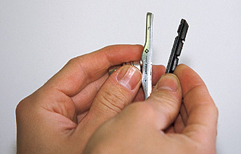 Nový špalek zasuneme do botky – opět vystačí ruka. Pokud se špalku do botky nechce, může pomoci například Iron, nebo jiná kapalina, která vyprchá a nemastí. Na lícové straně špalku je vidět drobnou „rýhu“. Skrz ni povede perko zajišťující špalek v botce.