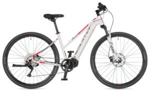 Hodně osobité kolo, jakých dnes už mnoho nejezdí. Dámský rám, dámské kolo z kategorie kros, to znamená, že lehce jede po cyklostezce, poradí si se zpevněnou šotolinou, hodně silné je na asfaltu. Krátká stavba zajistí pohodlný posed, nízký rám snadný nástup. Lehkost jízdy je v jeho genech jako hlavní rys. Shimano Deore a uzavíratelná vzduchová odpružená vidlice, spolu s motorem Shimano E-6100 a baterií Shimano E-8035 patří k vyššímu střednímu standardu, tyto komponenty rozhodně nebudou patřit ke slabinám, ba naopak.
