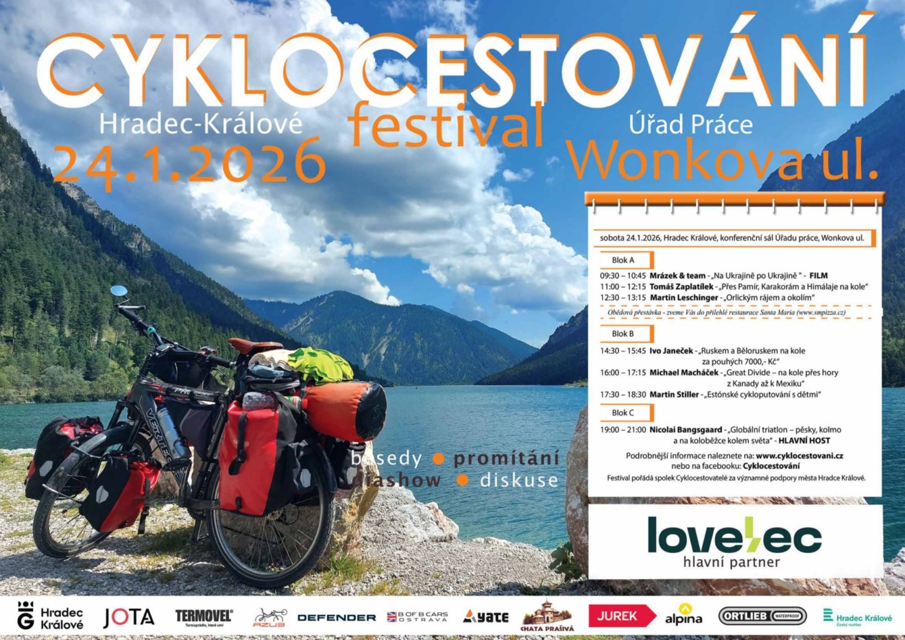 16:00 – 17:15 Michael Macháček – „Great Divide – na kole přes hory z Kanady až k Mexiku“ 17:30 – 18:30 Martin Stiller – „Estónské cykloputování s dětmi“