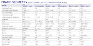 Všechny rámy jsou vybaveny otočnou vložkou flip chip pro nastavení rozvoru, průchodnost rámu je až pro 53 mm široké pláště. Delší rozvor zvyšuje stabilitu kola a také průchodnost pneumatik, zatímco kratší rozvor zajišťuje rychlejší a agilnější ovládání.