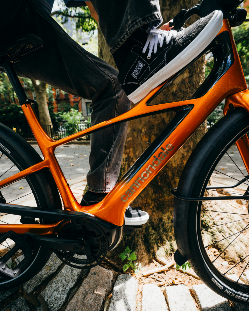 Do rámu FlyingV byl zakomponován dobře prověřený a zároveň jeden z nejpoužívanějších elektromotorů současnosti pro městská elektrokola, Bosch Performance Line SX. Ten poskytuje výkon až 600 W a točivý moment 60 Nm. Díky tvaru rámu je elegantně ukrytý a „šťávu“ odebírá ze stejně tak zamaskované baterie Bosch CompactTube s kapacitou 400 Wh. S touto kombinací Cannondale slibuje dojezd až 115 km. Baterie pak nejde kvůli úspoře hmotnosti a tuhosti celku z rámu zcela vyjmout. K dispozici je také PowerMore Range Extender o kapacitě 250 Wh. Kolo lze zároveň snadno spojit s telefonem (pomocí AppTag a aplikací Cannondale) a ze smartphonu tak udělat palubní displej. K tomu slouží držák SPC+ (a univerzální úchyt u verze FlyingV 1) umístěný na představci.