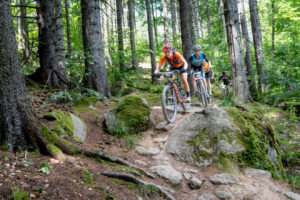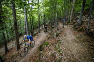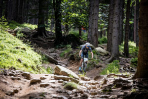 Netrvalo to dlouho a ani to tolik nebolelo a byli jsme na první občerstvovačce, na 18. km. Vzali jsme do ruky jen vodu a pokračovali dále. Netrvalo dlouho a přišel stoupací trail, klikatil se na úbočí hory. Kličkovalo se na úzké pěšině mezi sem tam kameny, sem tam kořeny, vláček cyklistů stoupal vzhůru. Občas jsem musela vycvaknout, protože rovnováha už nebyla stoprocentní. Trail byl sice stoupací, ale občasné klesání umožnilo využití teleskopky a vnitřní poděkování kolu Lapierre XR 9. 9. , že některá nepředvídaná zhoupnutí zvládlo za mě. Ne všichni závodníci měli celopéra s teleskopickou sedlovkou, tímto bych jim chtěla vzdát hold, že se na hardtailech pustili do těchto náročností.