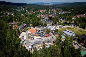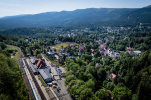 Večer jsme se ještě odhodlali více prozkoumat místo našeho bydliště. Hned vedle hotelu, asi pět minut chůze, byly Krkavčí skály (Krucze Skaly), kde se pohodlně dalo vyjít na vyhlídku, která nabízela výhled na řeku Kamienna pod nimi. Na skálu vedla i ferrata, v jakém stavu je, to nechám na zkoušku ostatním dobrodruhům. Krátkou chůzí z kopce (to šlo rychleji) jsme se dostali do centra Sklářské Poruby. Obchody, restaurace, butiky… Vše praskalo ve švech. Na můj vkus na mě centrum dýchlo konzumem, který nevyhledávám, ale alespoň jsme měli možnost sondovat, kdo s námi bývá na trase závodu – ať už podle finišerských triček (skandální, až po závodě si jej můžete obléct!) nebo podle konverzací k trase samotné. Obkroužili jsme centrum a čekal nás výstup zpět k hotelu na večeři. Večer jsme si ještě zrekapitulovali třetí etapu, zjistili jsme, kolik času máme náskok na druhý pár v celkovém pořadí, prozkoumali jsme trasu čtvrté, poslední etapy a s paprsky dopadajícími na vrcholky Krkonoš jsem upadla do vytouženého spánku.