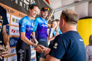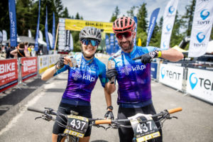 A zvládli jsme to s celkovým časem 15 hodin a 56 minut, s 220 kilometry a 6800 výškovými metry v nohách. Rázem byla zapomenuta bolest a trápení a přišla jen čistá euforie. Slečny v cíli nás ověsily krásnou finišerskou medailí a my to namířili rovnou na závěrečný bufet a poslední pasta party. Na nějaké vytočení nohou jsem už neměla ani pomyšlení a maximálně jsem byla ochotná dojet 25 m na mytí kol. Na slavnostní vyhlášení jsme přišli umytí a natěšení, že trofej za první místo v kategorii Duo Pro Mix bude mít čestné místo na poličce.