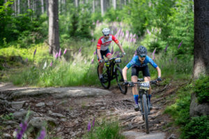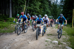 No, z této představy mě probudily hned první metry po startovním výstřelu. Odbočilo se doprava, do kopce, a hned se začalo stoupat v terénu. K tomu všemu tím, že jsme mohli startovat z první lajny, se začínal přes nás přehánět celý balík rychlých vlků a já se snažila trefit správnou lajnu ve stoupání, která by nevedla rigolem od vody. Do toho se soustředit, ať se nestřetneme řídítky, a tep letěl vzhůru k výšinám. Prvních ostrých sto metrů vystoupáno a začalo klesání proložené pár brdky. Nejdřív po šotolině, ale pak vidíme z dálky pořadatele, který ukazuje, ať si přibrzdíme a koukám, jak Fuča dává teleskopku dolů. Začala první pořádná bikovačka! Skoro až enduro sjezd po turistické značce, úzká trasa, která byla adrenalinově osázená kořeny, volnými šutry a divochy na jednostopém vozidle. Tentokrát mi tep stoupal nadšením.