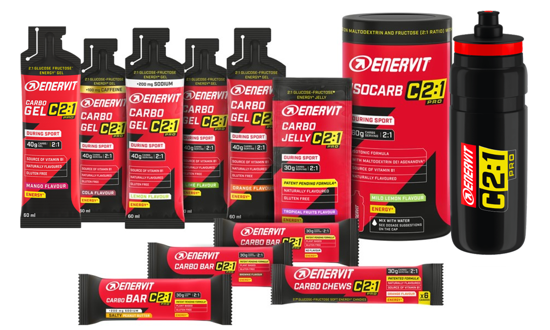 Specialista na výživu pro cyklisty a další vytrvalostní sportovce vyvinul unikátní řadu doplňků vycházející z fyziologických zákonů a praktických potřeb sportovců – řadu Enervit C2:1. Název odkazuje na hlavní přínos – obsah dvou druhů sacharidů (glukózy/maltodextrinu a fruktózy) v optimální kombinaci (2:1), aby mohly dodat maximální množství energie během sportu. Řada C2:1 obsahuje energetické gely, tyčinky, nápoj, želé i želatinky. S jejich pomocí tělu jednoduše a bez složitého počítání dodáte 30, 40, 60 nebo 90 g sacharidů. Pro dva výherce máme vše a ve všech druzích i příchutích!