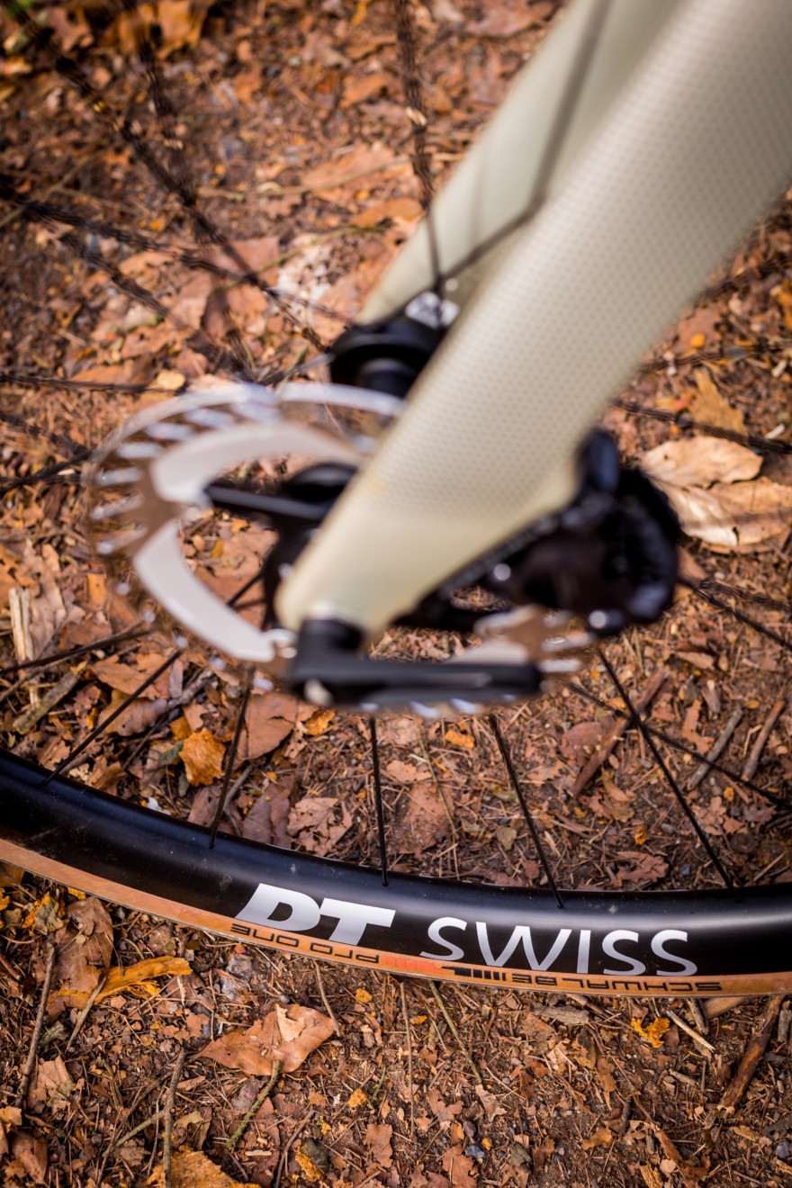 Jemné zabzučení je průvodní jev elektronického řazení, které pro testovaný stroj dodalo Shimano v úrovni Ultegra Di2. Co se týče převodů, přední kombinace 52/36 zubů ve spolupráci s kazetou s nejmenším 11zubovým pastorkem jsou velmi účinným nářadím pro zdolávání sportovních výzev. Když už se zmiňujeme o možném sportovním zaměření, vězte, že součástí levé kliky je i měřič výkonu 4iii Precision. Dalším z doplňků, který nenechá prostor pochybám, je zapletený set z produkce DT Swiss postavený na středně vysokých karbonových ráfcích, v jehož popisu naleznete informaci, že jde o lehká, odolná a nadprůměrně rychlá kola. Ta jsou oblečena do obutí Pro One z produkce Schwalbe, které stejně jako ráfky dokáže nabídnout možnost přestavby na bezduše, tedy nezanedbatelný další posun v oblasti pohodlí.