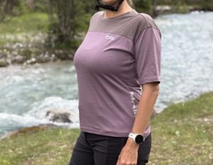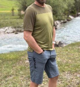 Mons Royale je novozélandský specialista na merino, zkušenosti jsou u něj znát. Složení materiálu není jednodruhové, nejde jen o „ovci“, vždy zohledňuje určení daného svršku, jeho zaměření. Zde vsadil na materiál Merino Shift v gramáži 140 g/m2. V jeho složení dominuje merino s 52 %, ale přidává se i recyklovaný polyester (35 %) a nylon (13 %). O usazení není třeba se rozepisovat, je to volný dres, sedí výborně, nebrání pohybu. Zajímavé a praktické jsou lemy na koncích rukávů a na zadní části průkrčníku – zpevňují materiál, ten tu lépe drží tvar.