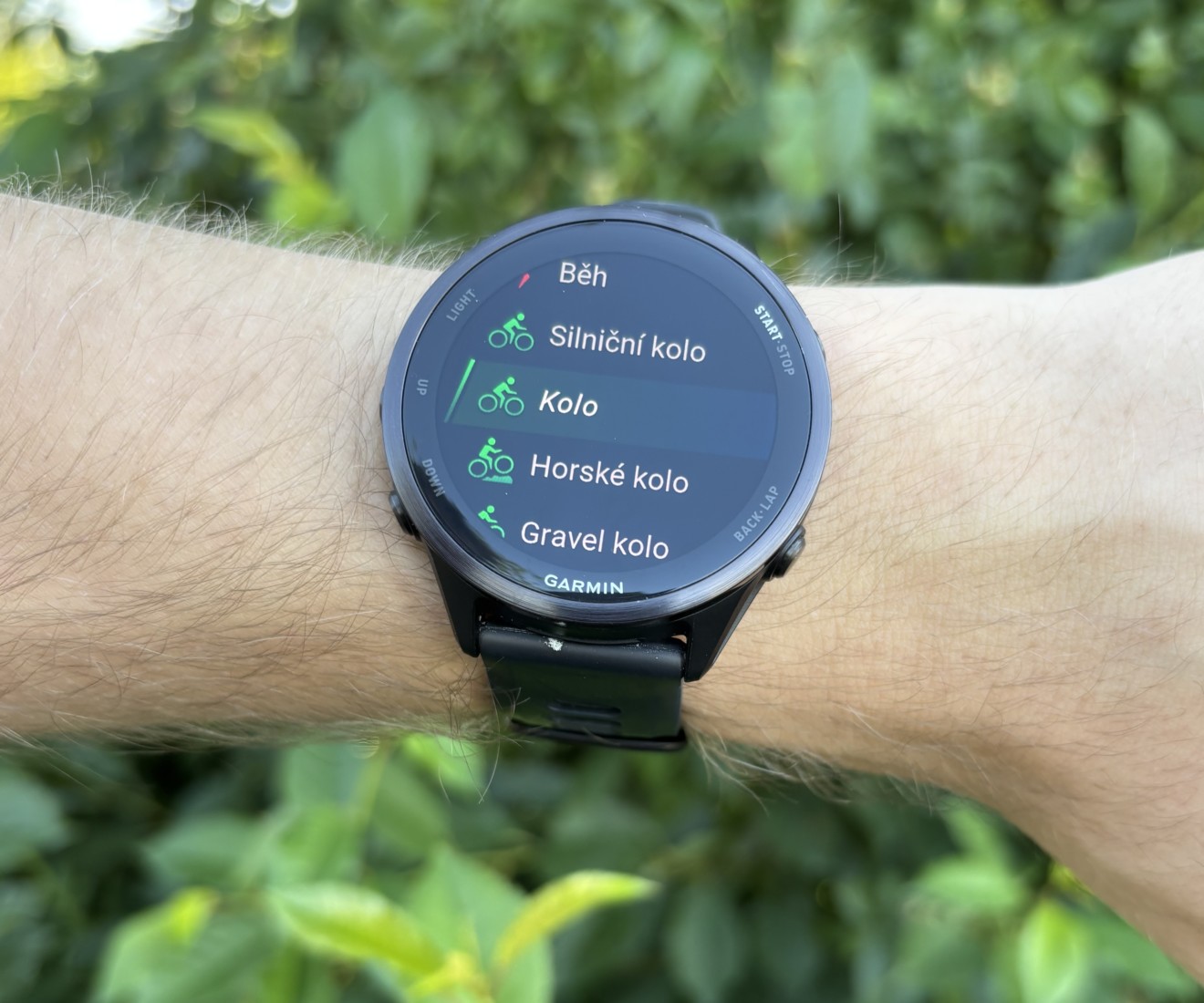 Největší kouzlo ale nastává u režimu sportu. Přece jenom jsou to především sportovní hodinky. Zmáčknutím horního tlačítka Start se otevře rozsáhlá nabídka, ve které je snad každý sport. Už jen po rozkliknutí sekce Cyklistika se nabídne osm různých variací.