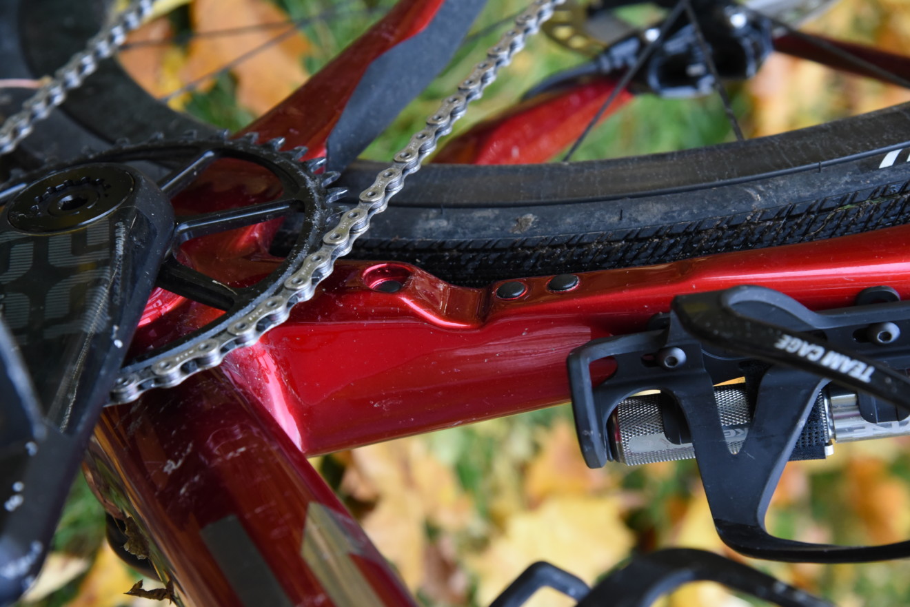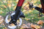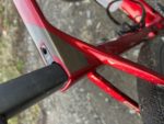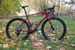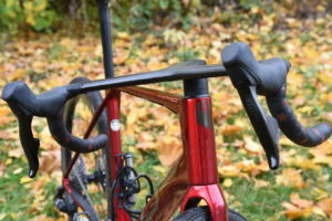 Karbon jako jasný základ, pestře funkcionalistické tvary trubek a na nich hluboký rudý lak se zrcadlovými logy. Nádherný celek zvýrazňuje kompletní vnitřní vedení lanek (v našem případě nikoliv, bezdrátově řadil Sram) a hadic, řídítky počínaje, z nichž okem uvidíte jen nezbytné kousky. Pevná osa, rozhraní Flat Mount pro montáž třmene brzdy, kompatibilita s přesmykačem (připraveny jsou montážní body pro něj i pro vodítko) i elektronickým řazením Di2, to jsou další praktické detaily.