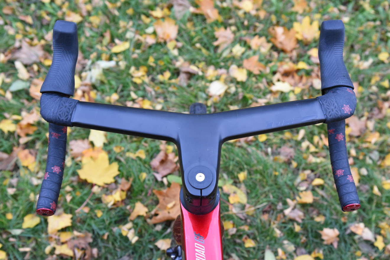 Drobné rozpaky, možná subjektivní, přineslo karbonové kombo řídítek a představce ONE Bikeparts. Netýkají se jeho rozměrů. Šířka řídítek 460 mm v jejich lehkém spodním rozkročení i délka představce 80 mm vhodně korespondují s velikostí rámu L. A co víc, velmi příjemné je předsazení oblouků – plochá horní partie řídítek míří od představce vpřed, není kolmá k ose kola jako obvykle. Tvar reflektuje přirozenou pozici rukou. Však je zkuste natáhnout před sebe v simulovaném posedu na kole – že máte zápěstí lehce vytočené? V tomto směru je úchop velmi příjemný.